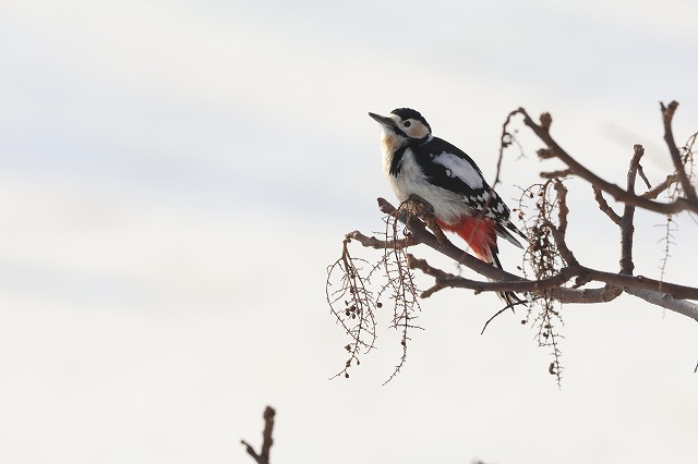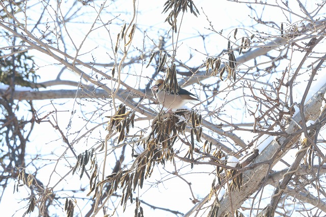 2月7日土曜日8時45分頃森の家付近に飛んで来て、少しずつ木を移りながら採餌する雄1羽10分ほど近くでじっくりと観察することができました(写真)。
