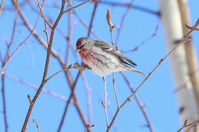 最初は電源盤近くのカツラの種子を食べていましたが、少し移動してそれほど高くないエゾヤマザクラの木の冬芽を食べ始め、10分ほど順光の状態でじっくりと観察できました。