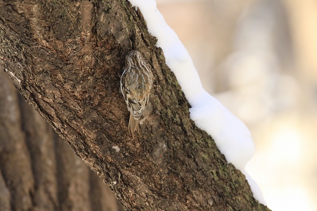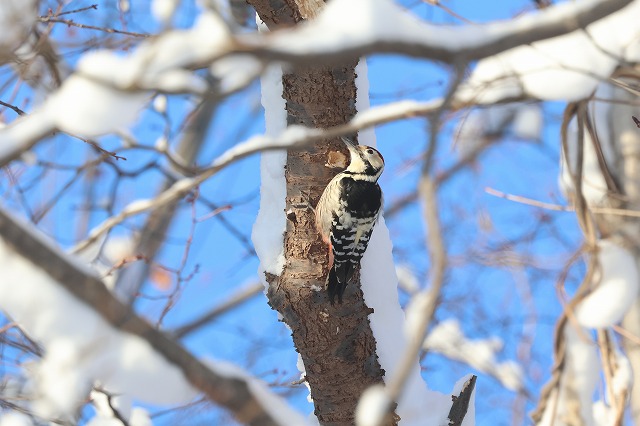今週もほぼ毎日見られていますが、やはり「キョッ」という鳴き声はあまり聞かれず、木をつついたり樹皮がはがれたりする音で気づいて探すといることがよくあります。