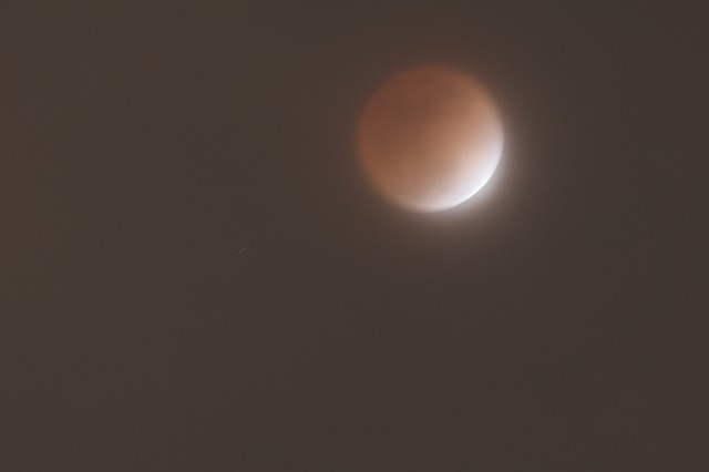 当日は曇りで皆既月食は見られないと思っていましたが、実際には雲の向こうになんとか赤い月を見ることができました。