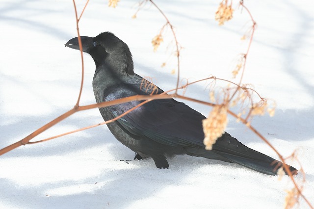 3月24日、「噴水広場」で1羽がオニグルミの実=クルミをくわえていましたが、落として割るにはまだ地面の雪が解けておらず、食べずに持って飛び去りました。