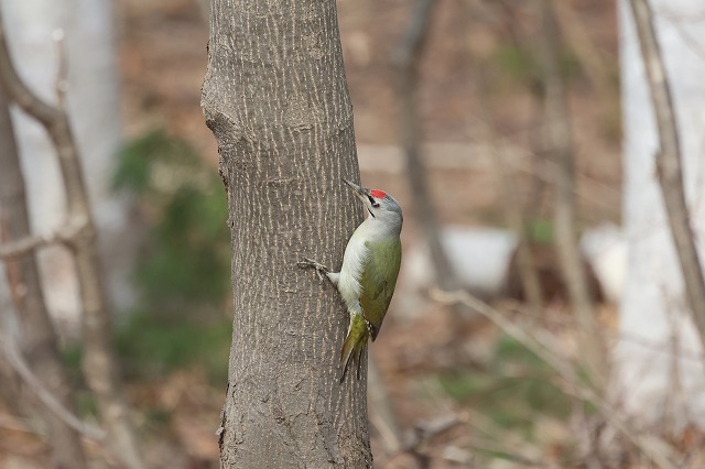 次の写真の下はその時のものですが、ヤマゲラは毎年4月に「学びの森」周辺で地面に降りている姿を目にすることがあり、今年もそうなってきました。
