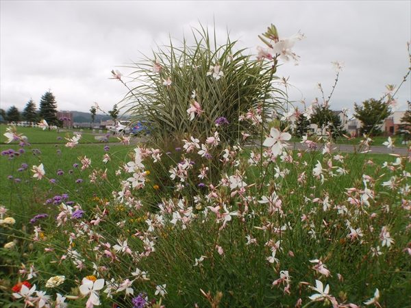 ときおり雨がパラついていた明日風公園の花壇は、夏の雰囲気から衣替え。