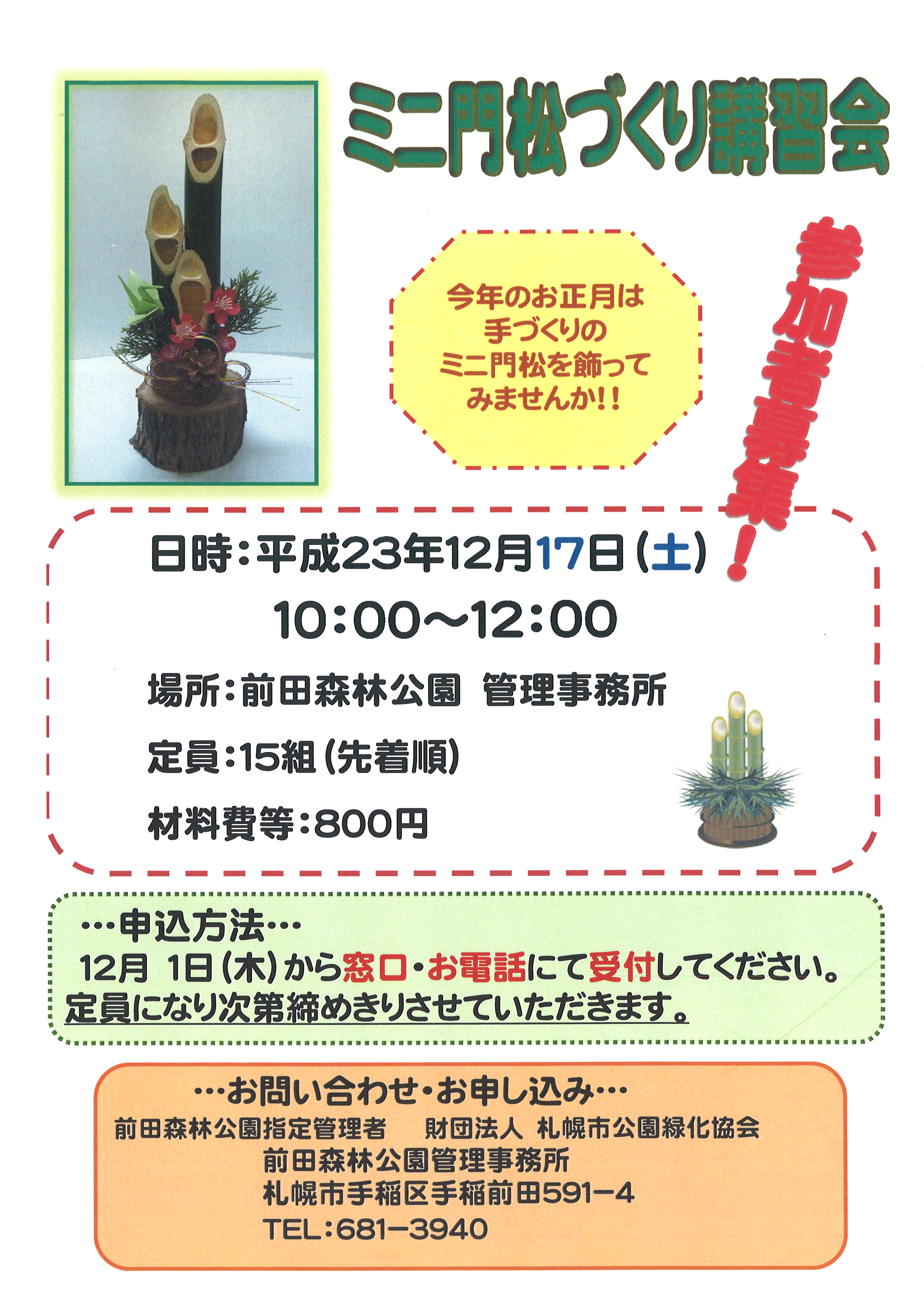 お問合せは 前田森林公園管理事務所まで TEL:011-681-3940