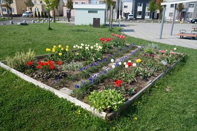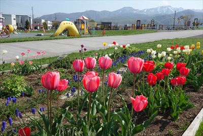 明日風公園で活動しているボランティア、明日風フィオーレが管理する花壇で、チューリップが見ごろです。 今日はあたたかいですが、徒渉池の解放は6月9日(土)~9月9日(日) 時間:10:00~16:00 を予定しています。もうすこしお待ちくださいね。