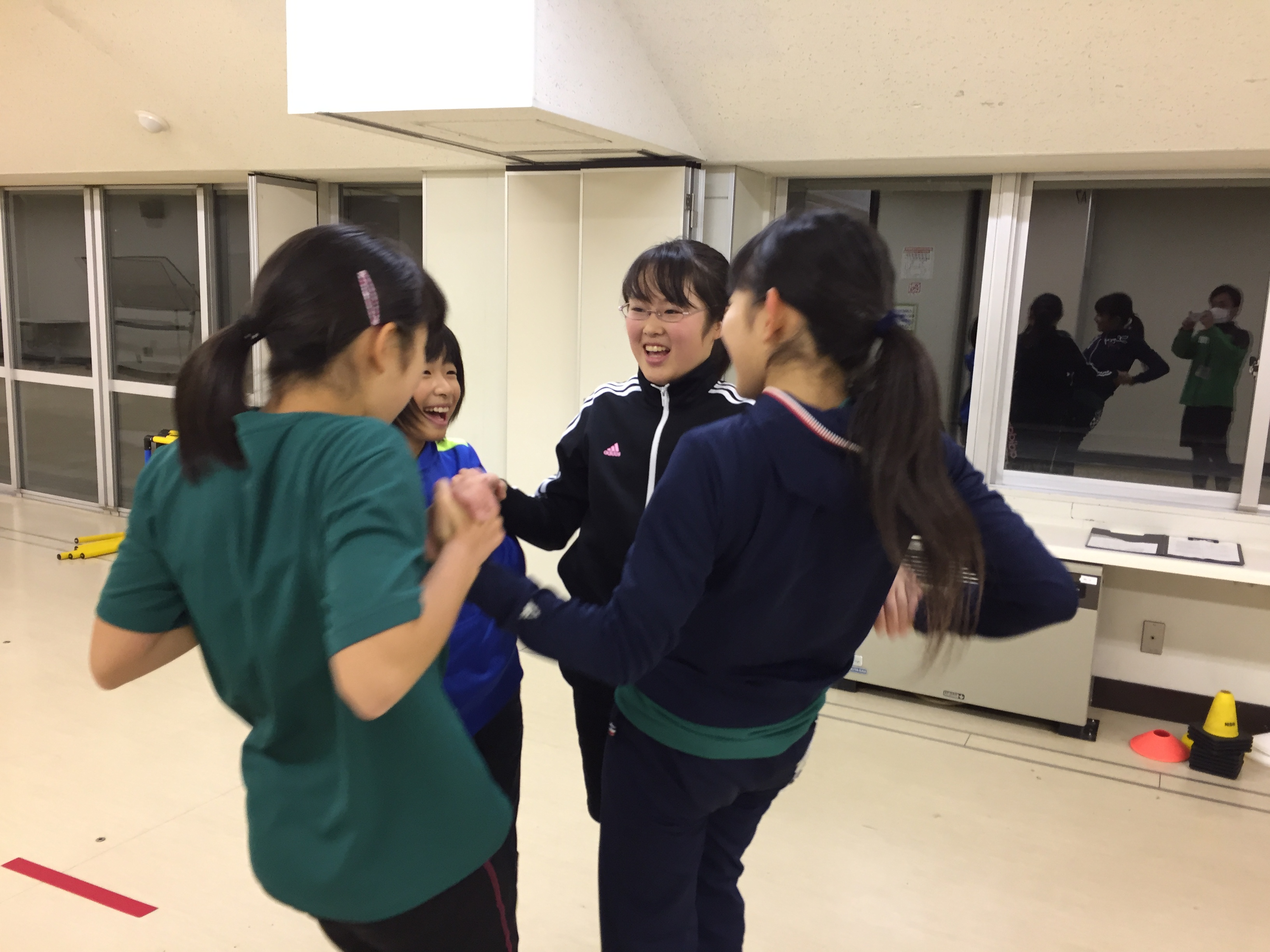 また、グループで向かい合い、息を合わせて同時に立ち上がる運動も行いました。