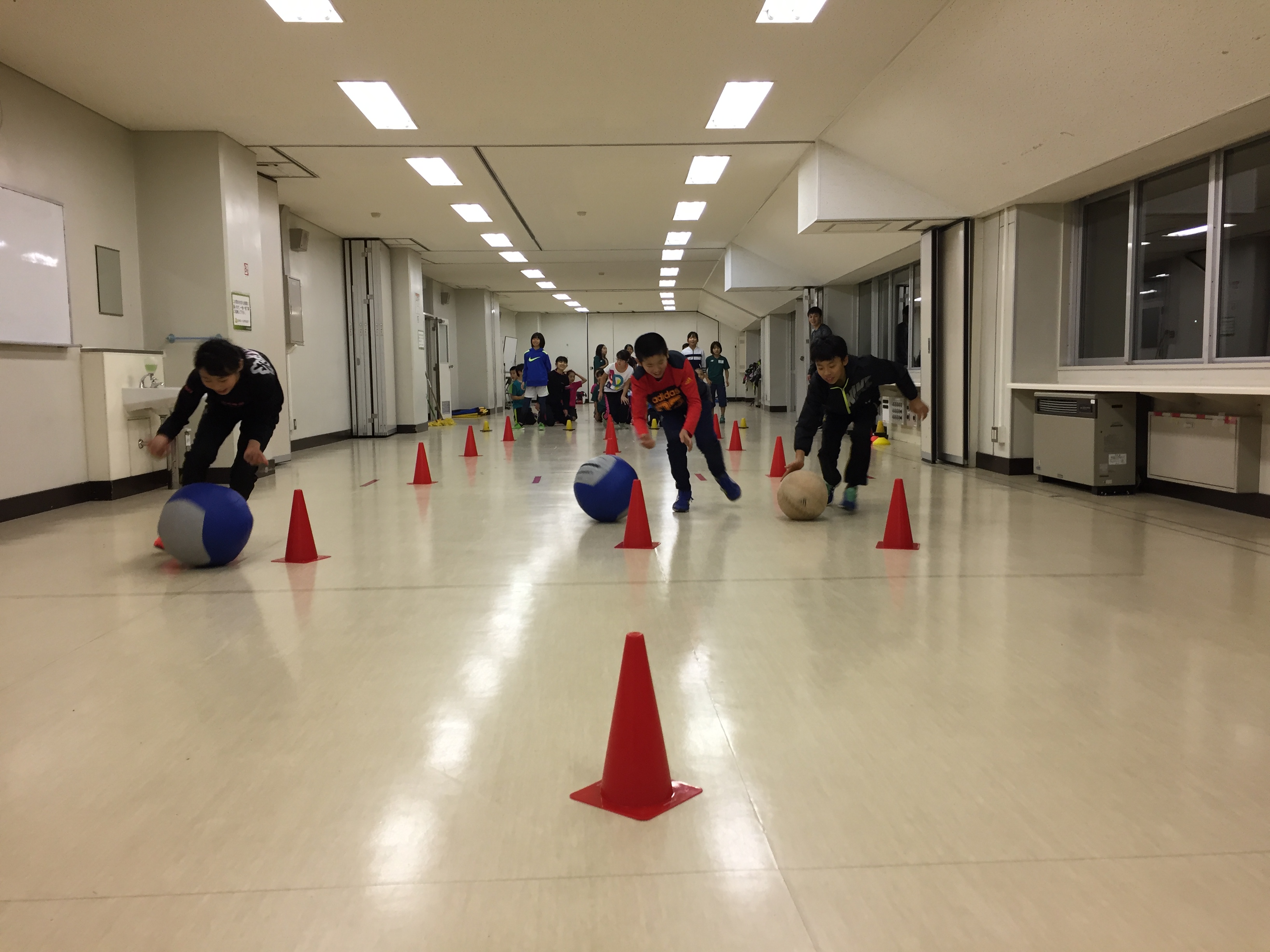 その後は、ショートダッシュを行い最後はメディシンボールを使った「玉ころがしリレー」