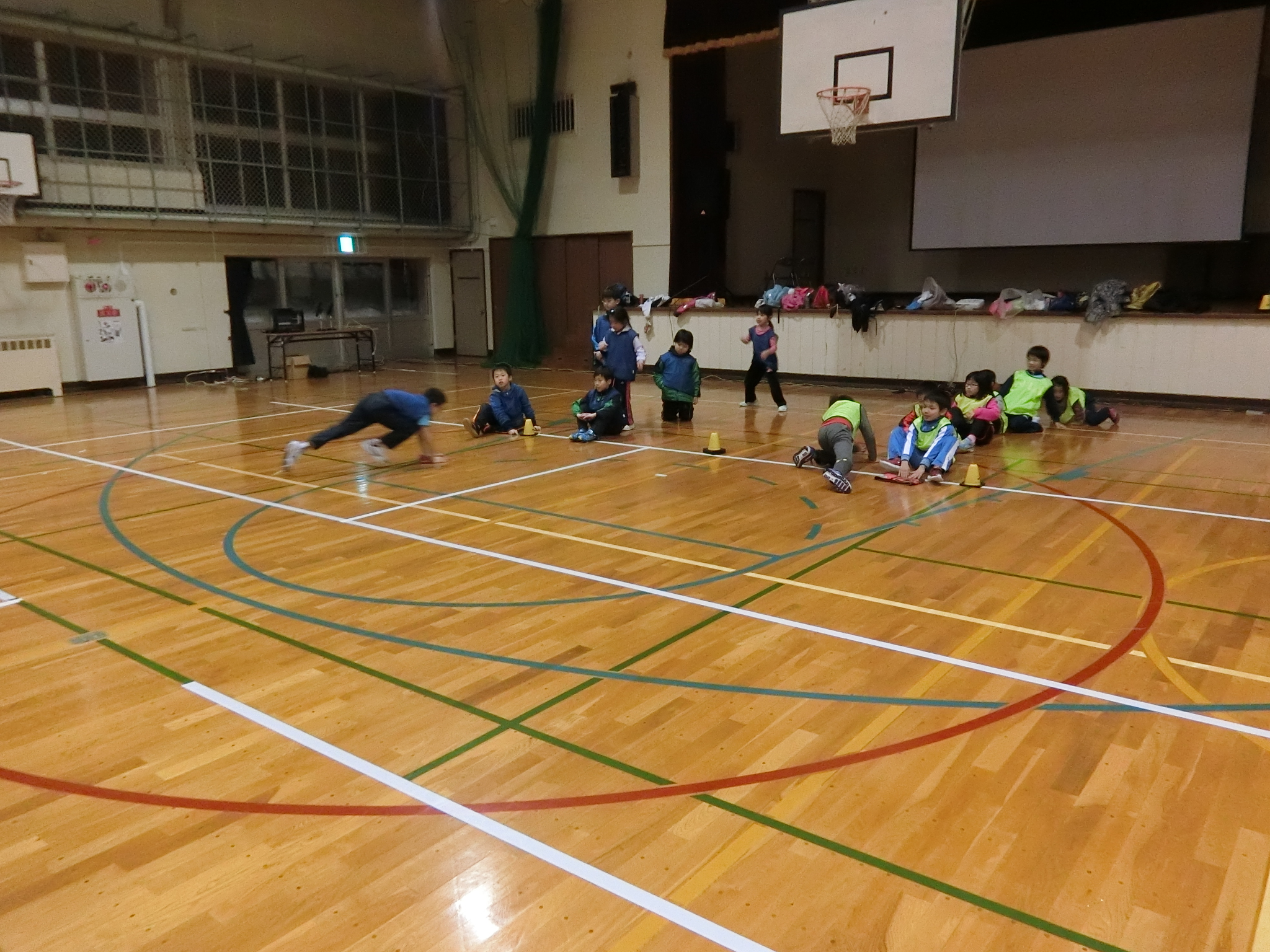 キッズ前半の活動は廊下を使い大好きなリレーを行いました!