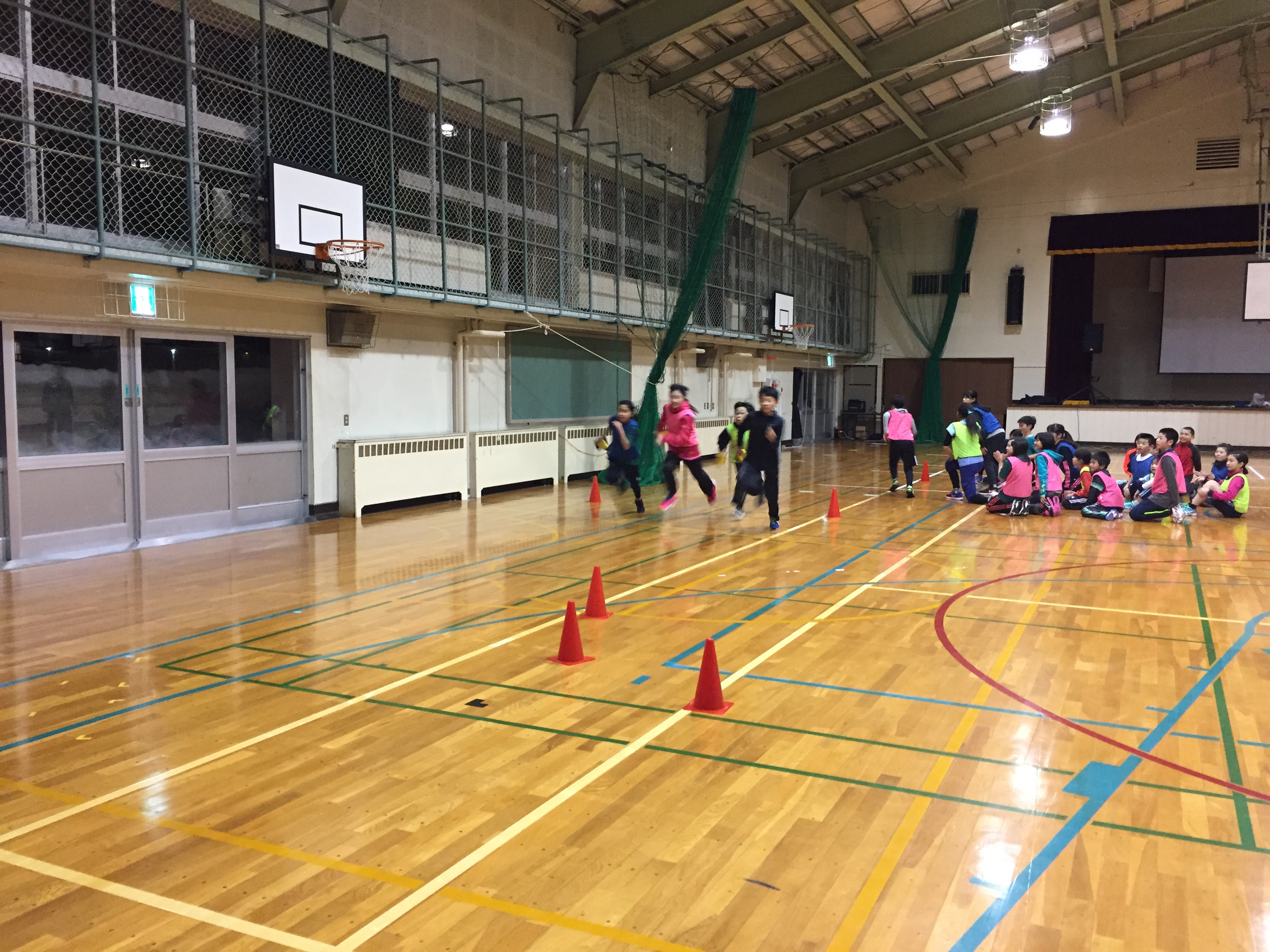 体育館内をトラックに見たて3チームで行ったリレー。