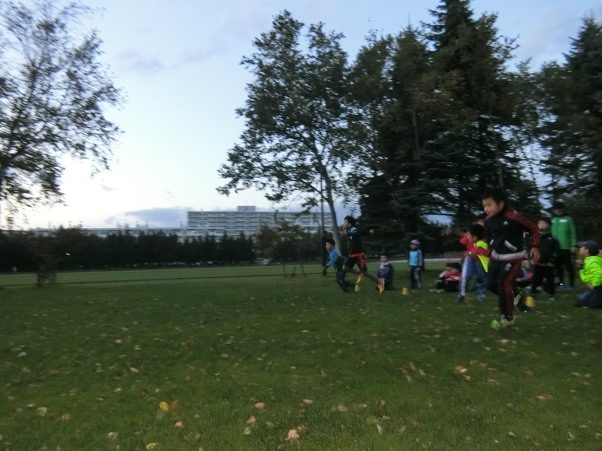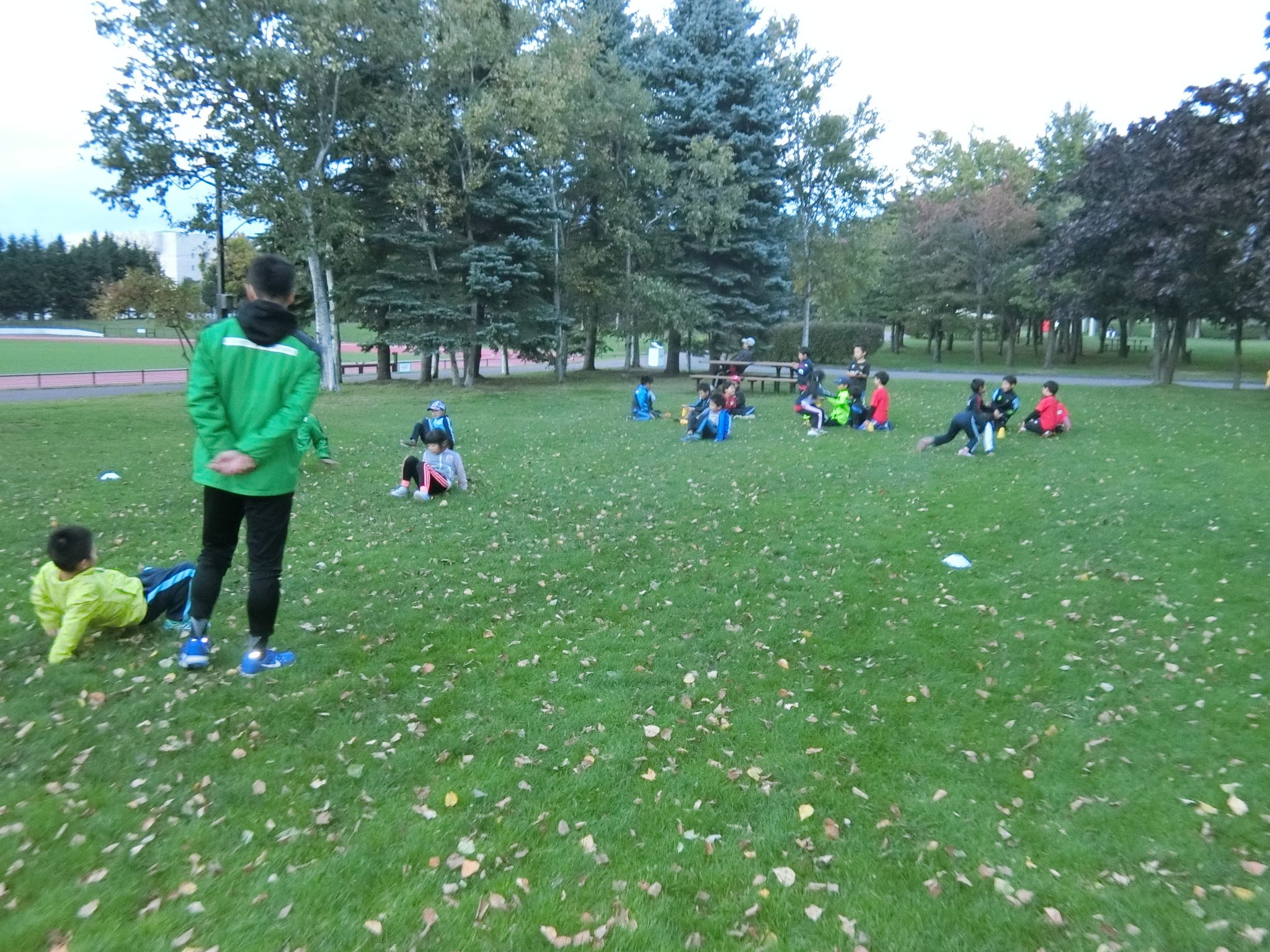 枯れ葉の散らばった芝生広場。