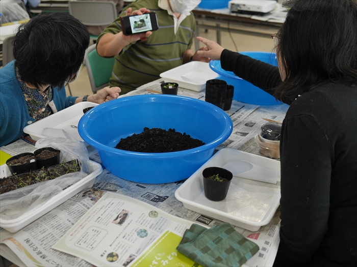 1回目の種まきの経過をスマホの写真を見たり、持参した苗を見て、お互いの育苗環境について話し合いました。