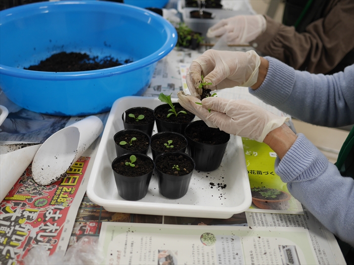 ペチュニアは6㎝ポットに他粒まきをしてポット上げしましたが、そのほかの方法でのポット上げも行いました。