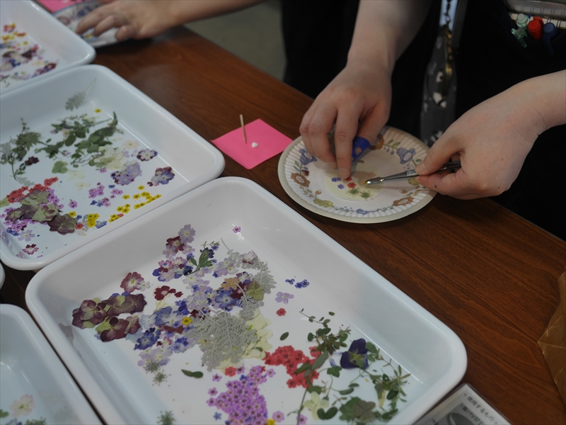 みなさん真剣に押し花を並べて、ご自身のイメージする作品を作られました。