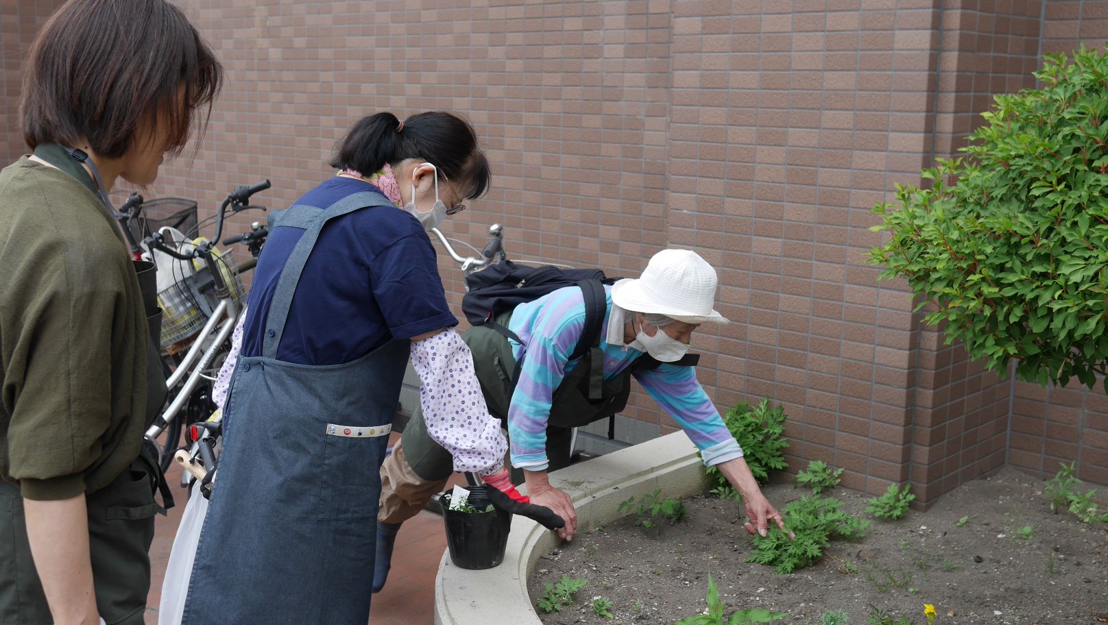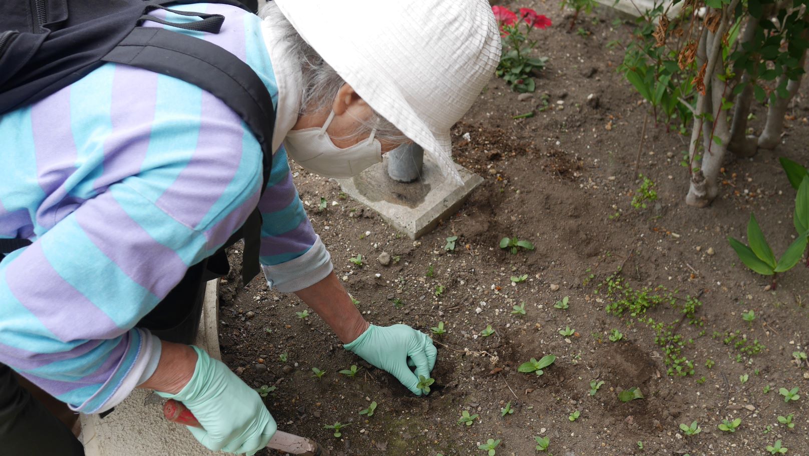 花がらや雑草を取りながら、皆さんが植えた覚えのない植物を見ながら「雑草かな?なんだろうね?」と楽しそうに観察している場面も。
