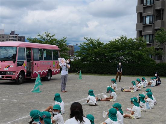 かわいい園児74名を前に大張り切り。事務局から紙芝居風にタネだんごつくりの説明をしました。