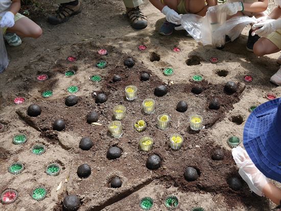7月12日、幌南幼稚園の年長組さんがタネだんごを作って月寒幼稚園の花壇に植えました。