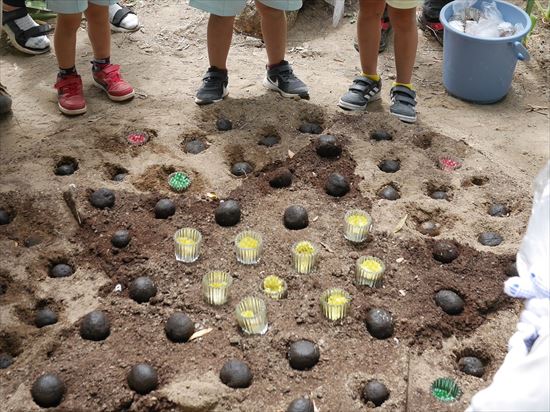 上手に土でおおきなお団子を作り、小さな種に戸惑いながらも上手につけました。