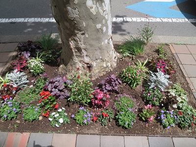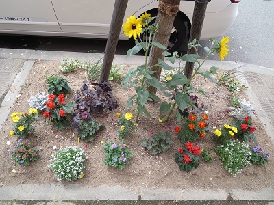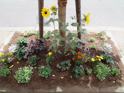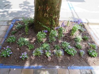 病院の入り口に一番近い街路ますは、医療従事者のみなさまに感謝をこめて青色の花を植えた