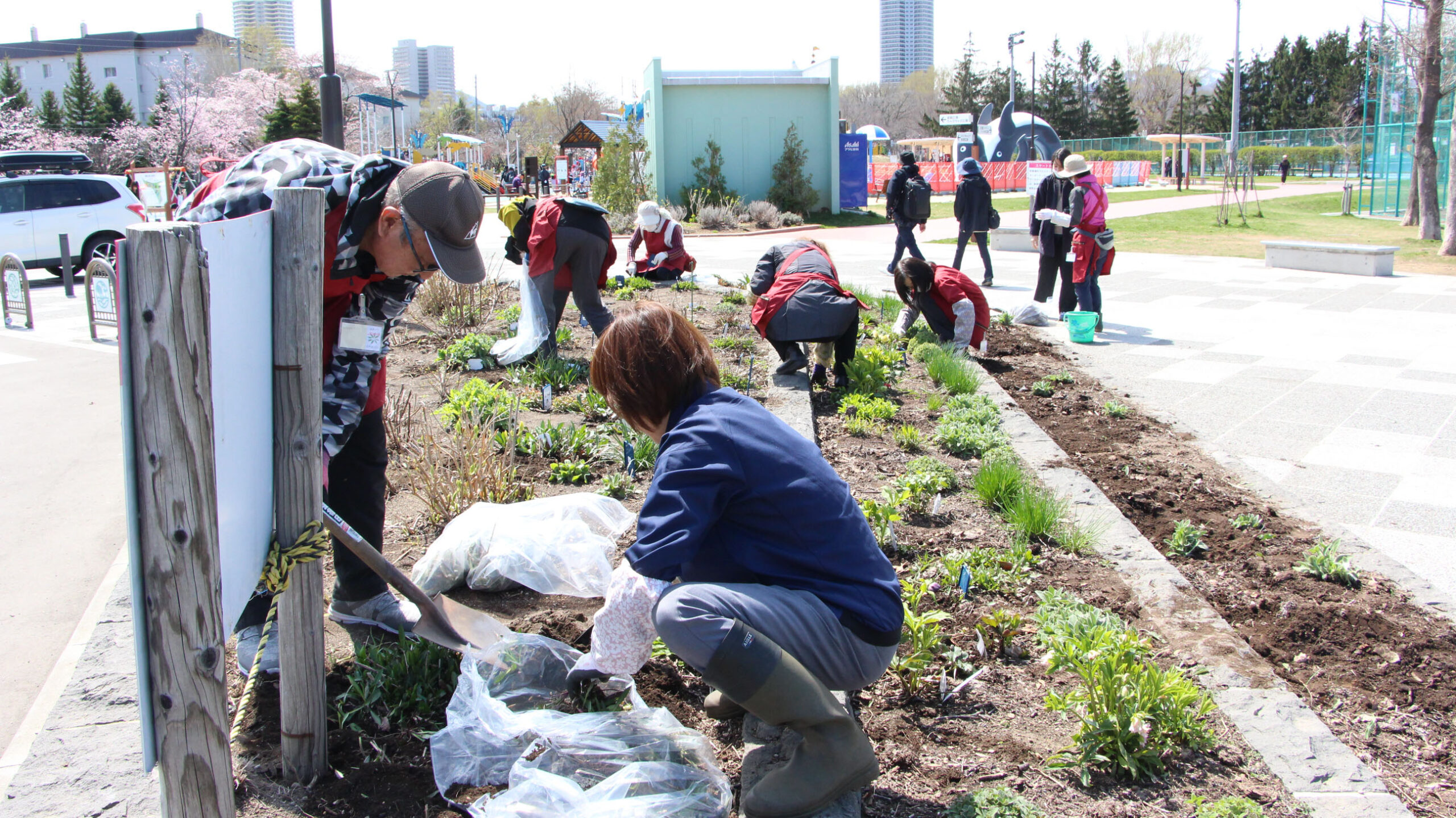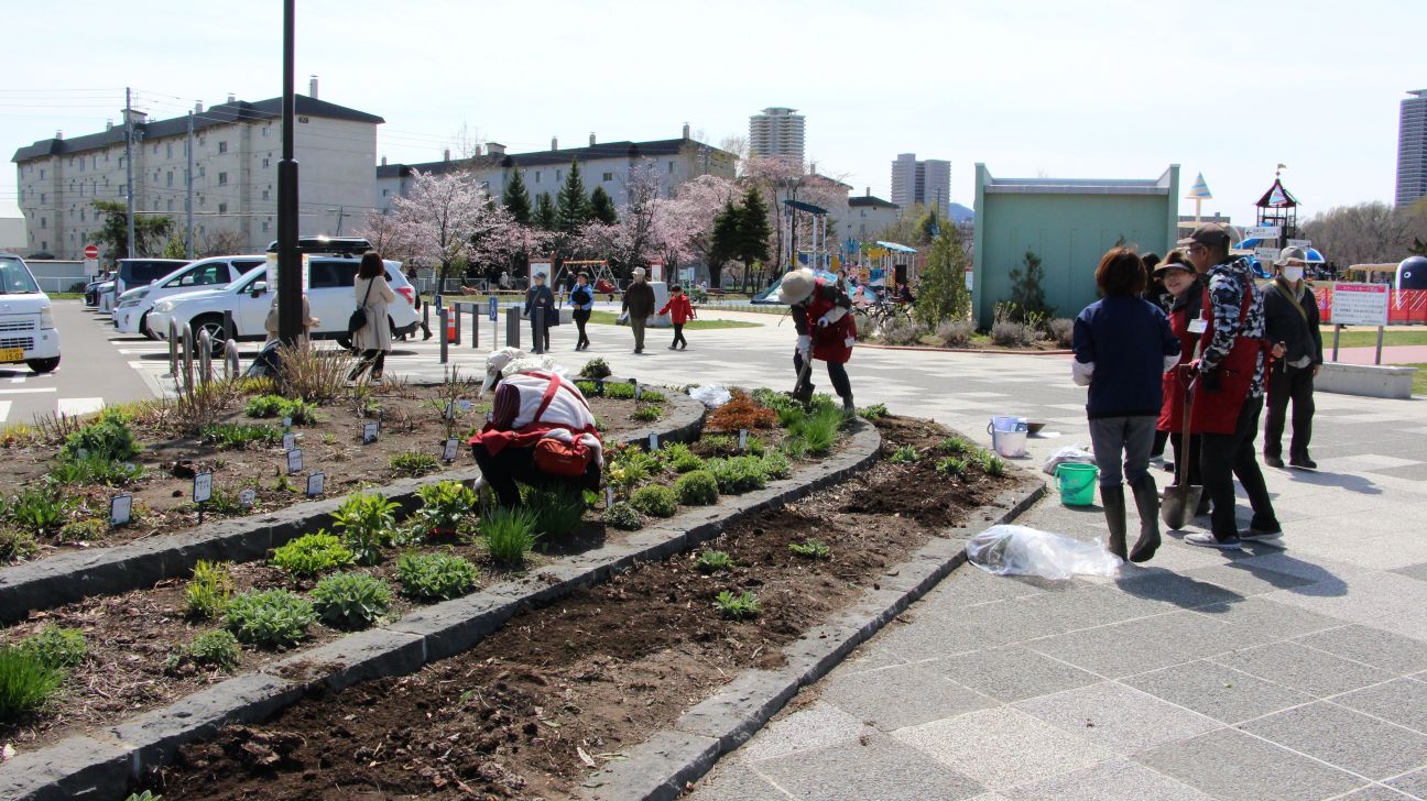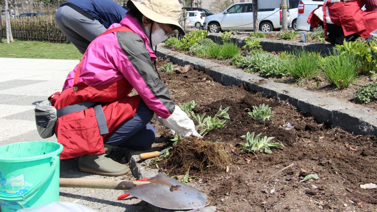 この日作業していた駐車場と遊具との間にある花壇はR2年度の改修工事の際に造成され、そこからこちらの花壇でも活動が始まったそうです。