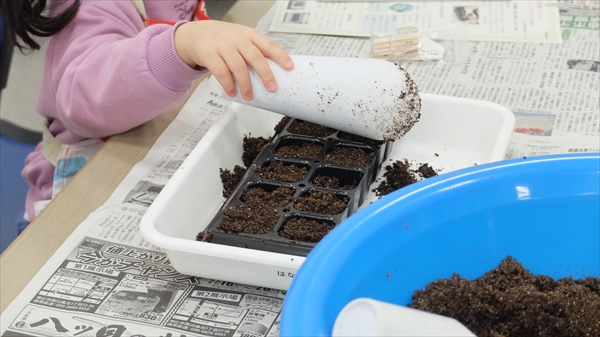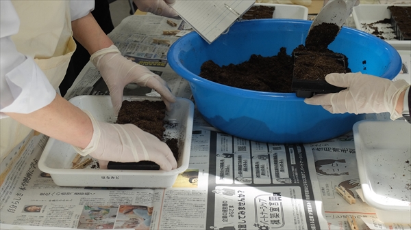 まずは土をセルトレイに入れるところからスタート。トレイ全体に、均等に土を入れます。小さな参加者さんも丁寧に土を入れていましたよ。