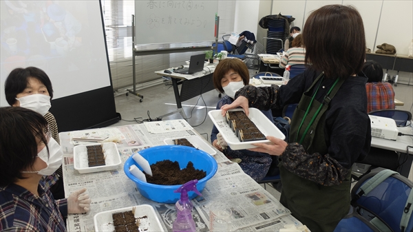 2月8日から講義と種まき育苗実習を受けてきた「種まきサポーター養成講座」受講生のみなさんは、この講習会では講師として参加者に種まきを教えました。