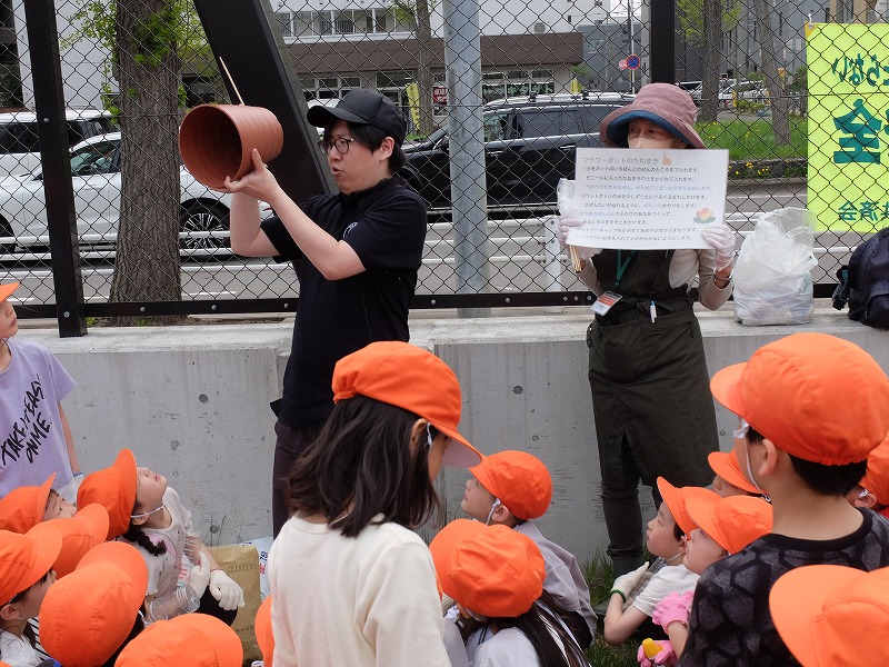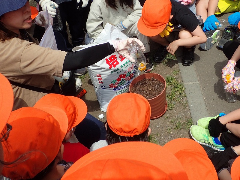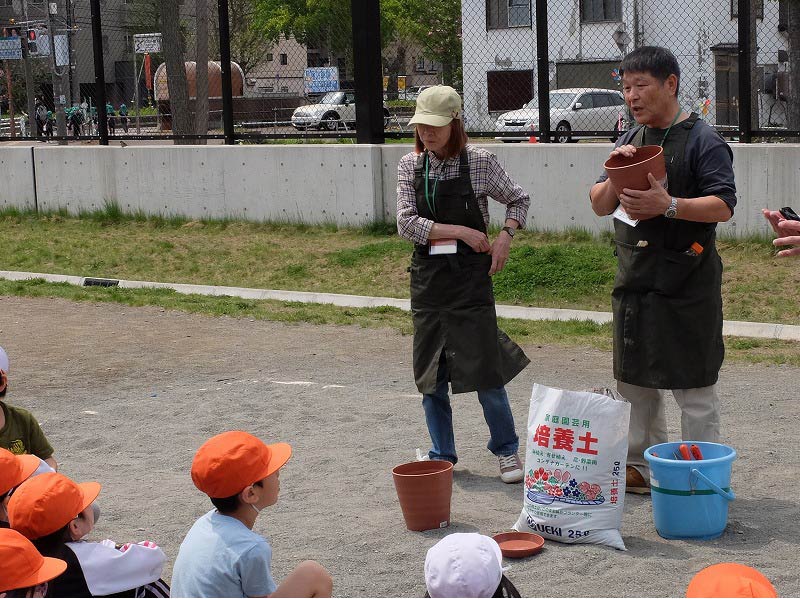 さっぽろタウンガーデナーは、生徒さんたちに合わせる姿勢で優しく見守りながら、たねまきを教えました。