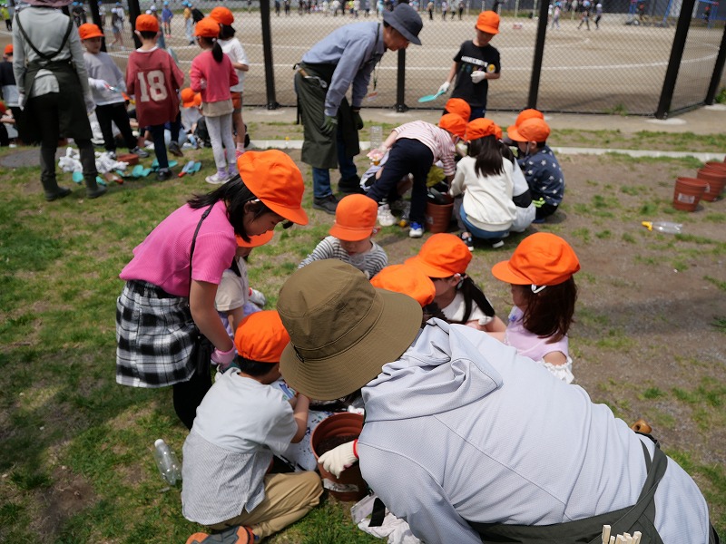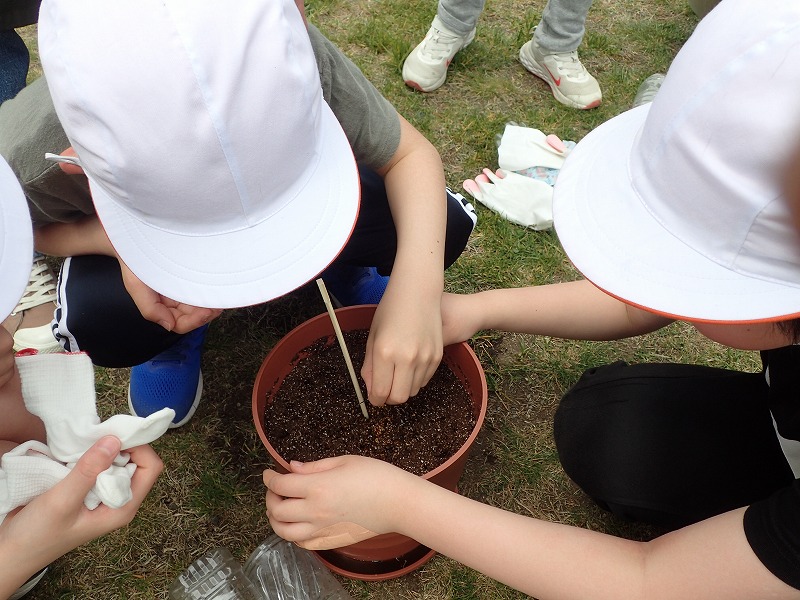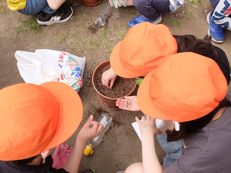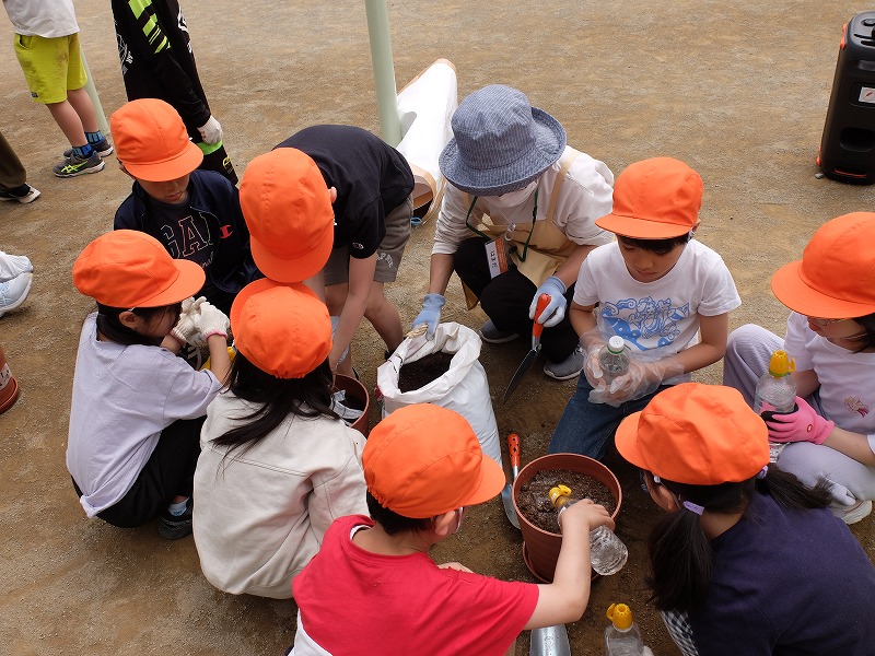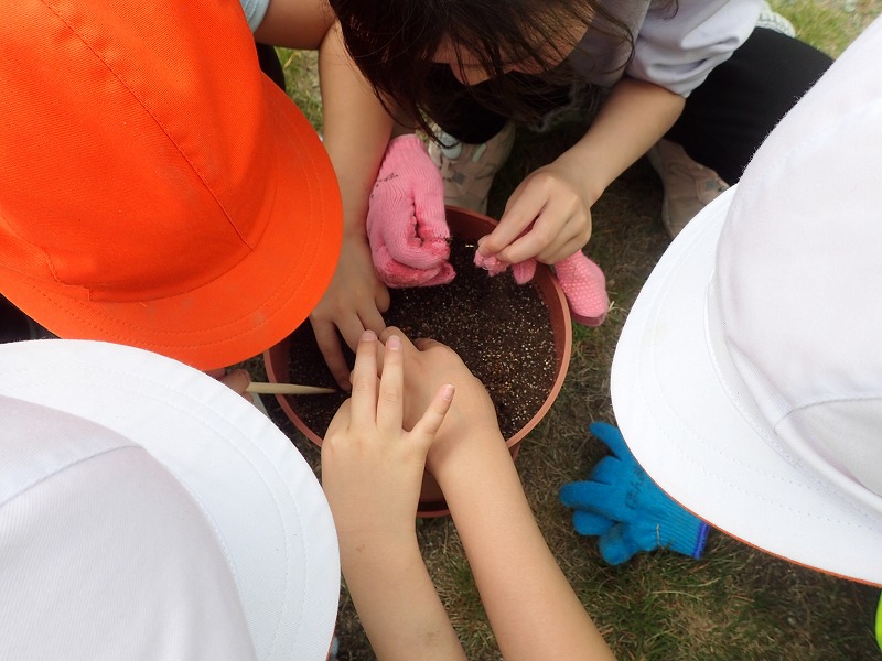 1つのポットに班のみんなで協力し合って種をまく姿を見て、「お互いに話し合って協力しあう姿が見られて関心したわぁ」「元気な姿に癒されました」との感想が聞かれました。