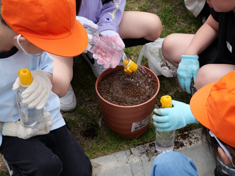 ポットへの土いれを一人ずつ順番に交代したり、水をこぼさないように一緒に運んだり。とても一生懸命にたねをまいた2年生のみなさん。
