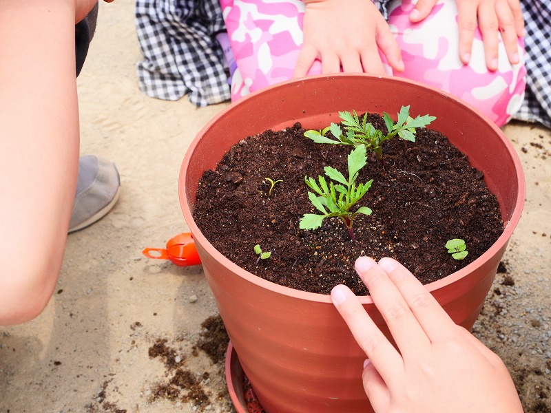 生徒さんたちが選んだ苗は、大きなマリーゴールドばかりではなく、まだ小さなケイトウやサルビアも、今までクラスのみんなで育ててきた全部の種類がミックスされたフラワーポットになりました。