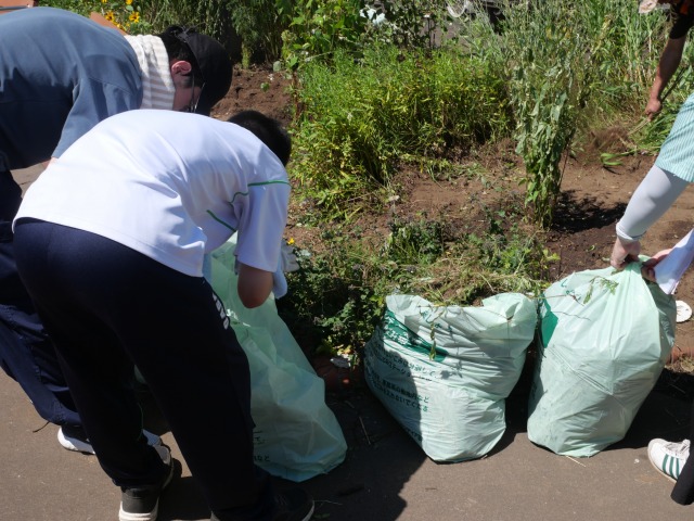 自分たちが抜いた植物の入ったボランティア袋を収集場所に運んで作業は終了しました。