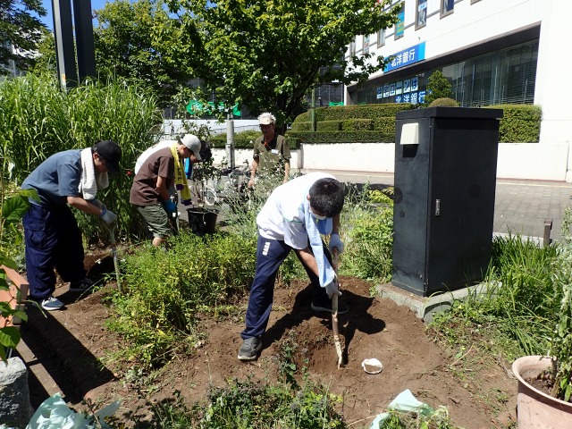 センダイハギは太い根が地中で絡み合っていて、スコップを差し込むことが難しく、なかなかはかどりません。