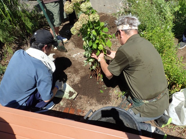 雑草を抜いてすっきりとした花壇に、今度はジューンベリー、アナベル、フジバカマを植えます。
