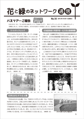 当ネットワークの会報誌「花と緑のネットワーク通信」の18号が完成しました。9月20日(木)に行ったバスツアーの報告や、タウンガーデナーの方とボランティア団体の活動紹介、2月に行う「花と緑のネットワーク交流会」の準備会の様子などを掲載しています。ダウンロードしてご覧いただけますので、ぜひご一読ください。