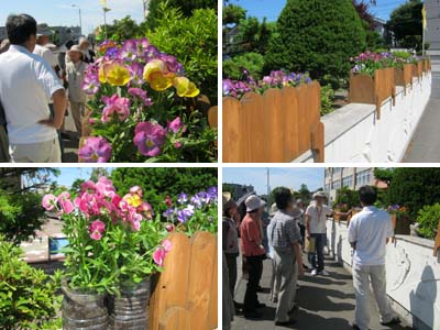 この日は「ちょうちょガーデン」から少し足をのばして、西区タウンガーデナーの永田さんが活動されている八軒北小学校にでかけました。ここでは永田さんが数年前からお一人で、学校を囲む塀の一部にプランターを設置したり、敷地内の花壇づくりをしています。プランターは手作りで、中にはペットボトルをリサイクルして作った鉢が入っています。こうすると、花の植え替えやプランターの移動がとても便利です。