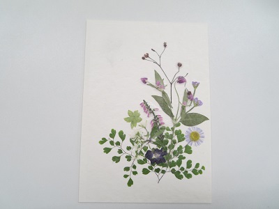 今回は、この押し花を使ってクラフトの試作品を作ってみました。はがきやレースペーパーに押し花をレイアウトして、ボンドで仮留めしラミネートします。
