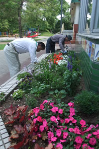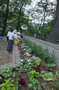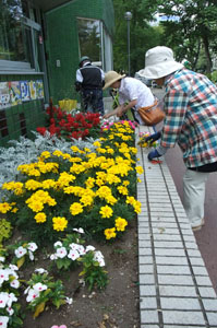 「タネ・苗交換会」終了後、中島児童会館花壇づくりのメンバーは、花壇のお手入れをしま