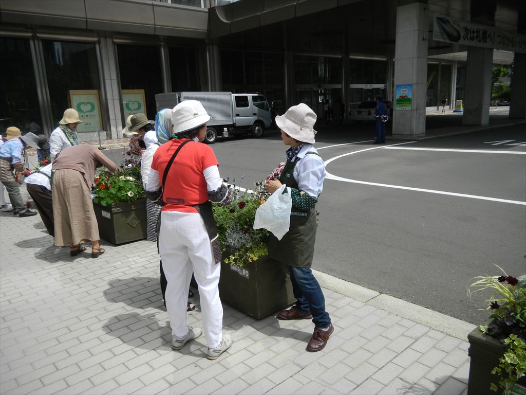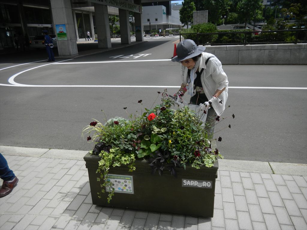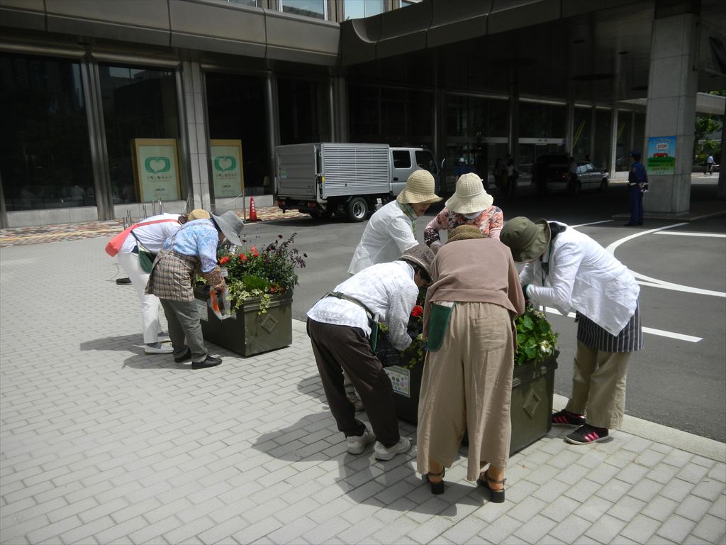 よく晴れて暑くなってきた今日、市役所前おもてなし花壇のメンテナンスを行いました。
