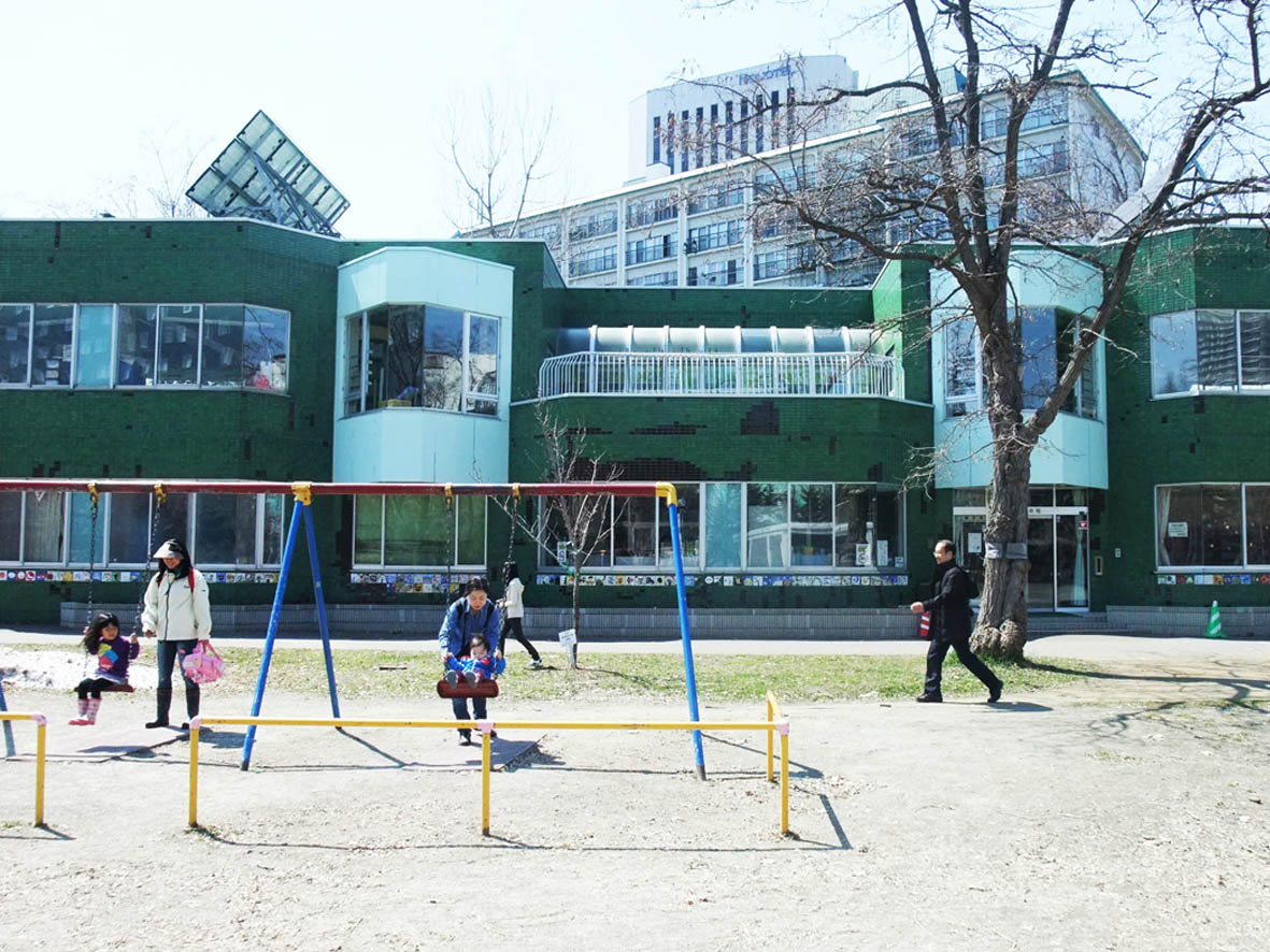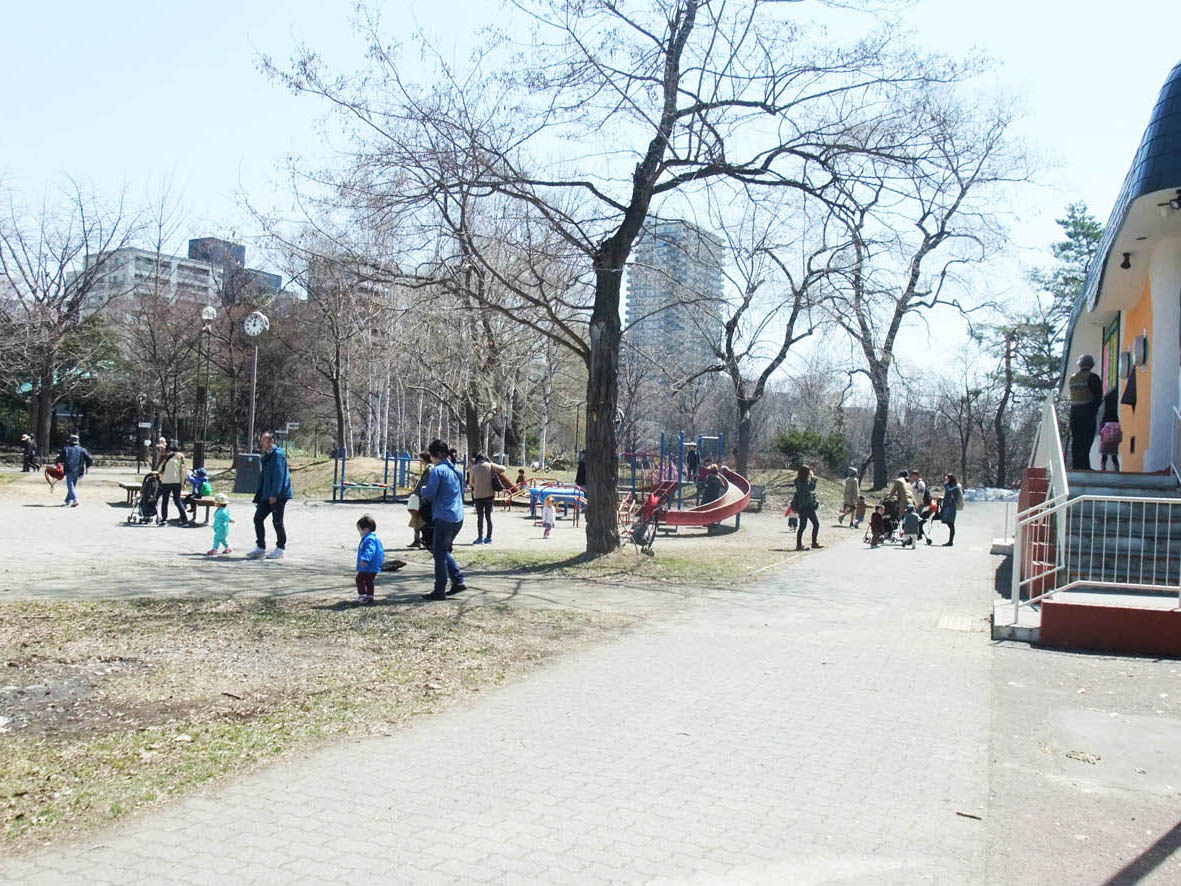 ぽかぽか陽気がとても気持ち良い札幌。中島児童館前ではたくさんの親子が遊んでいます。
