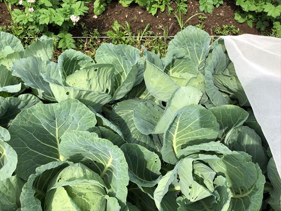 寒冷紗のトンネルの中で虫がつかないよう大事に育てられたキャベツは、見事に育っておいしそう!
