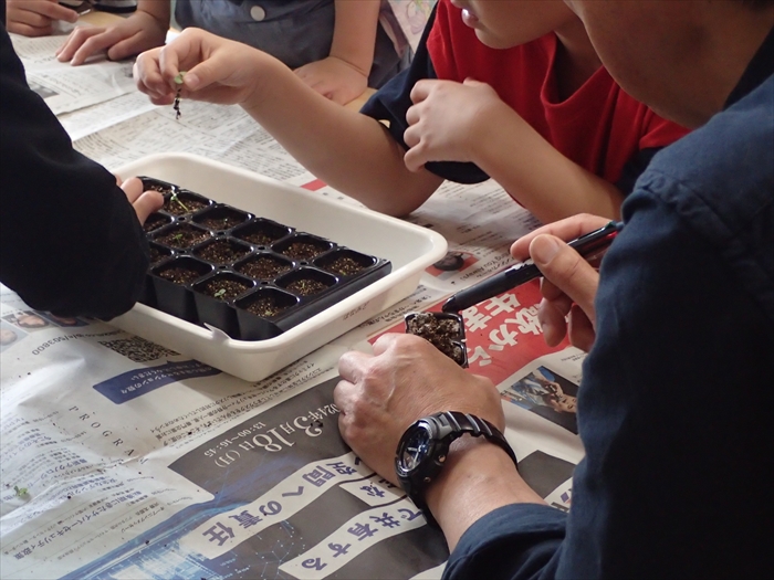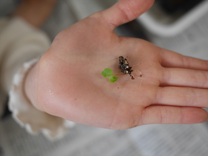 上手に間引きができた苗を、植えて戻します。とても小さな苗ですが、優しく上手に扱うことができました。