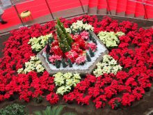 通路には赤いカーペット、コンテナにはポインセチアなどで飾ってあります。
