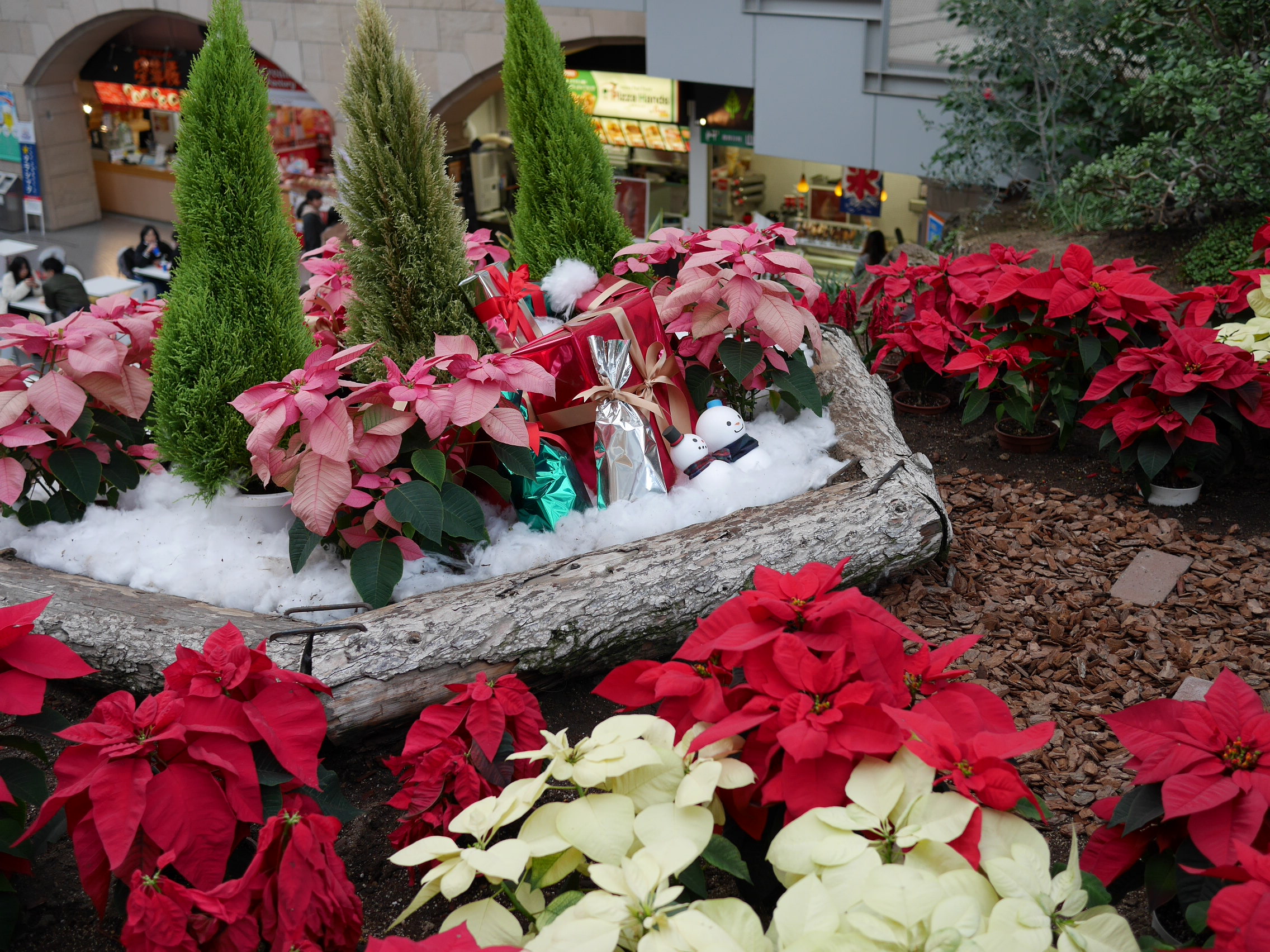 冬のお花が少ないこの時期ですが、サッポロファクトリーアトリウムでは、ポインセチアやコニファーを使ったこの時期らしい華やかな植栽を楽しむことができます。