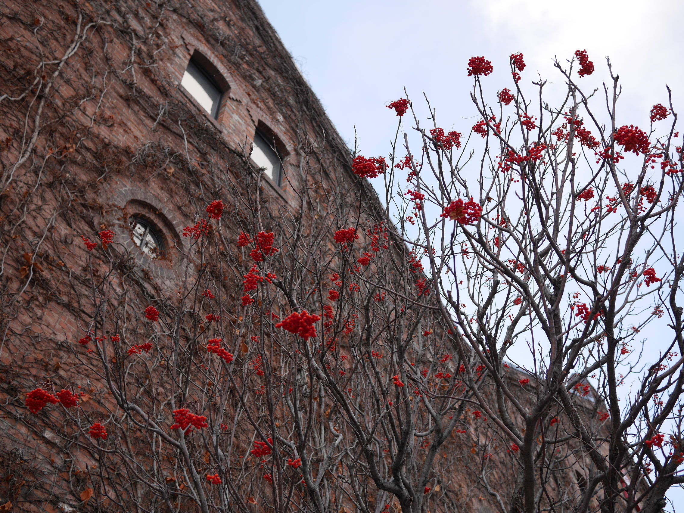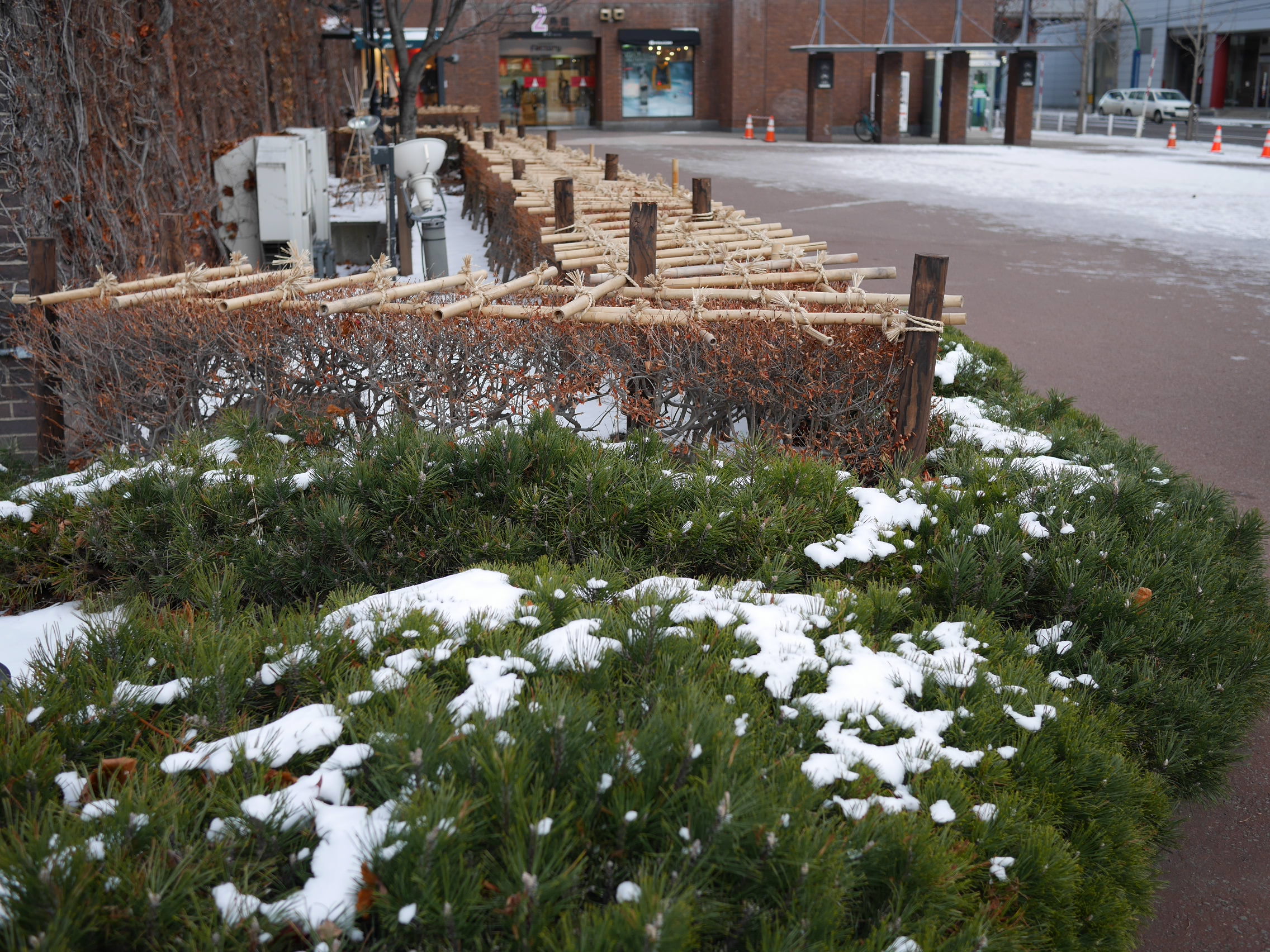 外では冬らしい景色が。紅葉していたツタの葉が落ちて、枝が茂っている様子が分かります。ナナカマドの赤い実は街路樹でもよく見かけます。そして垣根には冬囲い。マンションの多い街中ではちょっと珍しいかもしれませんね。みなさんのご自宅の庭や活動先では、冬支度はもう済みましたか?