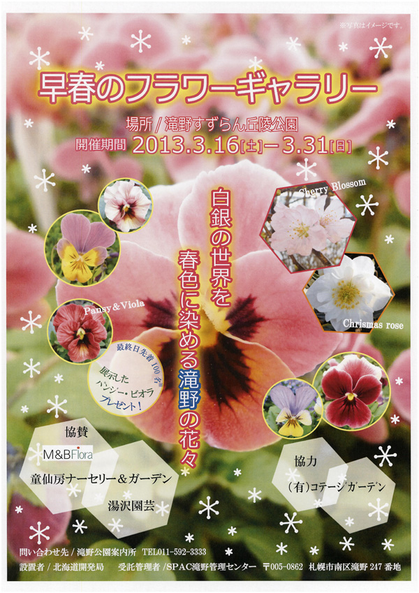関連行事ご案内 滝野にて「早春のフラワーギャラリー」開催 2013年02月15日 雪が残る滝野すずらん丘陵公園に、春の花が登場します! 白銀の世界を春色に染める滝野の花々で、春を先取りしませんか? Tweet 次へ 一覧へ戻る 前へ カテゴリー 新着情報 ブログ 事務局より ボランティア募集 主催イベント報告 団体活動紹介 ガーデナー紹介 関連行事ご案内 主催事業・イベント 講習会・検定試験 札幌市内の公園情報 2025-12-23 大通公園 ガイドボランティアさんの年内活動終了 2025-12-23 旭山記念公園 旭山記念公園野鳥情報2025年12月23日(火曜日) 2025-12-22 大通公園 さっぽろホワイトイルミネーション大通会場は12月25日まで 2025-12-22 滝野すずらん丘陵公園 滝野スノーワールド、明日(12/23)から開園!! 2025-12-21 前田森林公園 年末年始の管理事務所閉鎖について 2025-12-21 百合が原公園 冬至、冬中、冬始め(ミモザ苗販売のお知らせも 2025年12月21日) 2025-12-20 豊平公園 年末年始の豊平公園緑のセンター休館と駐車場閉鎖のお知らせ 2025-12-19 百合が原公園 今年最後のボランティア活動(2025年12月19日)