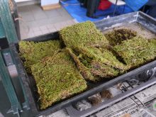 アイビーを植えた後は、シート状になっているハイゴケを霧吹きの水で湿らせやわらかくします。