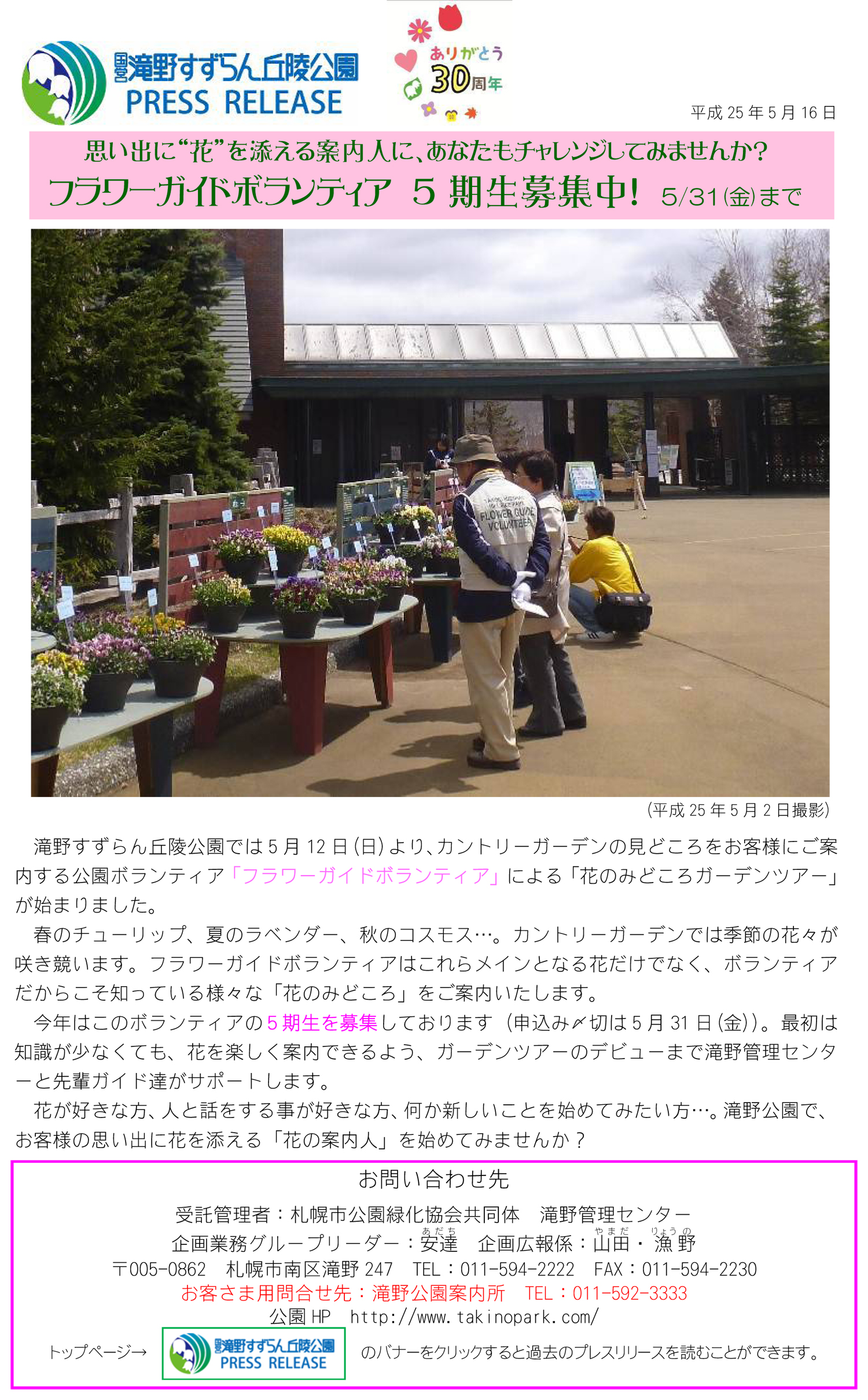 ボランティア募集 滝野すずらん丘陵公園でフラワーガイドボランティア募集中!! 2013年05月16日 ようやくサクラが咲いてきました。 今週末はお花見におでかけも良いですね♪ さて、滝野すずらん丘陵公園では、お客さまにガーデンのみどころをご案内する 「フラワーガイドボランティア」を募集しています。 詳しくはチラシをご覧ください。 ↓ ↓ クリックすると拡大できます ご興味のある方はぜひ下記お問い合わせ先までご連絡ください! 申し込み締め切り:5月31日(金) お問い合わせ先:滝野管理センター TEL:011-594-2222 担当:(安達) Tweet 次へ 一覧へ戻る 前へ カテゴリー 新着情報 ブログ 事務局より ボランティア募集 主催イベント報告 団体活動紹介 ガーデナー紹介 関連行事ご案内 主催事業・イベント 講習会・検定試験