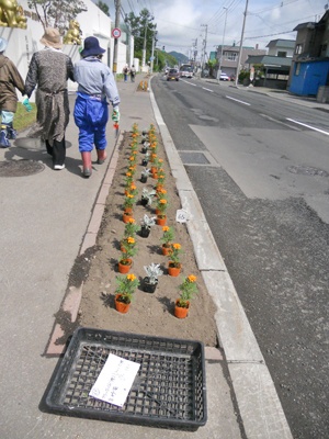 道路沿いの緑地帯には、会の方々の手で、すでに苗が並べられていました。