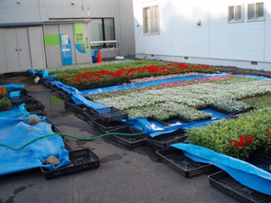 また、メンテナンスの負担を軽減するための工夫も考えました。植込みの前日、苗を3~4時間、腰水漬けします。そうすると苗が丈夫になって、シーズン中の水やりが不要になるそうです。