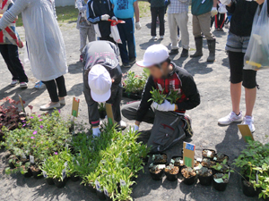 「平岡みどりの輪」のみなさんが作ったデザイン画を手に、植え込む苗を探します。