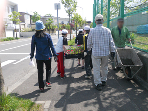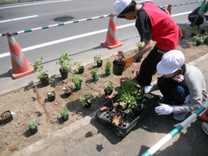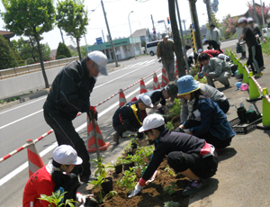 これまでの活動では、道路の片側にのみ植栽をしてきましたが、今年はもう一方の側の緑地帯にも植栽することになり、道路沿いの平岡小学校の6年生46名が、総合学習の一環として、花苗植えに参加してくれることになりました。
